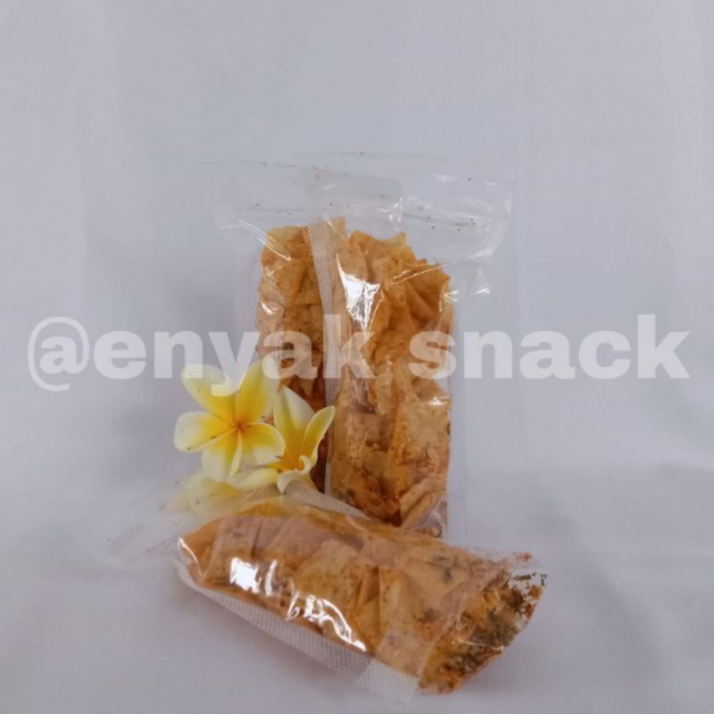pangsit goreng terbuat dari kulit pangsit yang dipotong dadu dan di beri bumbu pedas