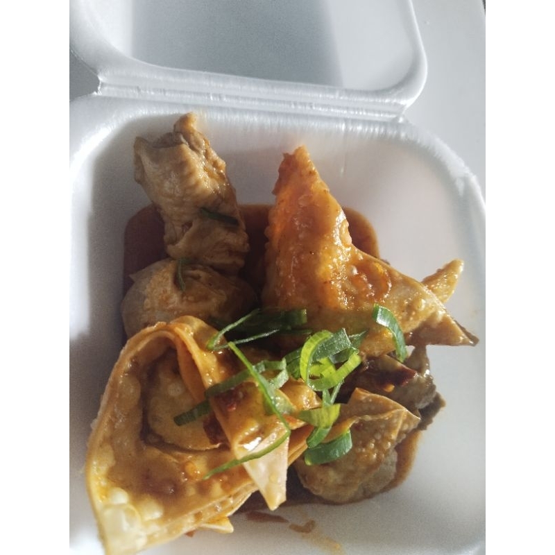 pangsit dengan isian ayam giling dengan bumbu berkualitas di jamin endulita dan bumbu cili oil dengan bumbu rahasia yang pasti menambah selera makan