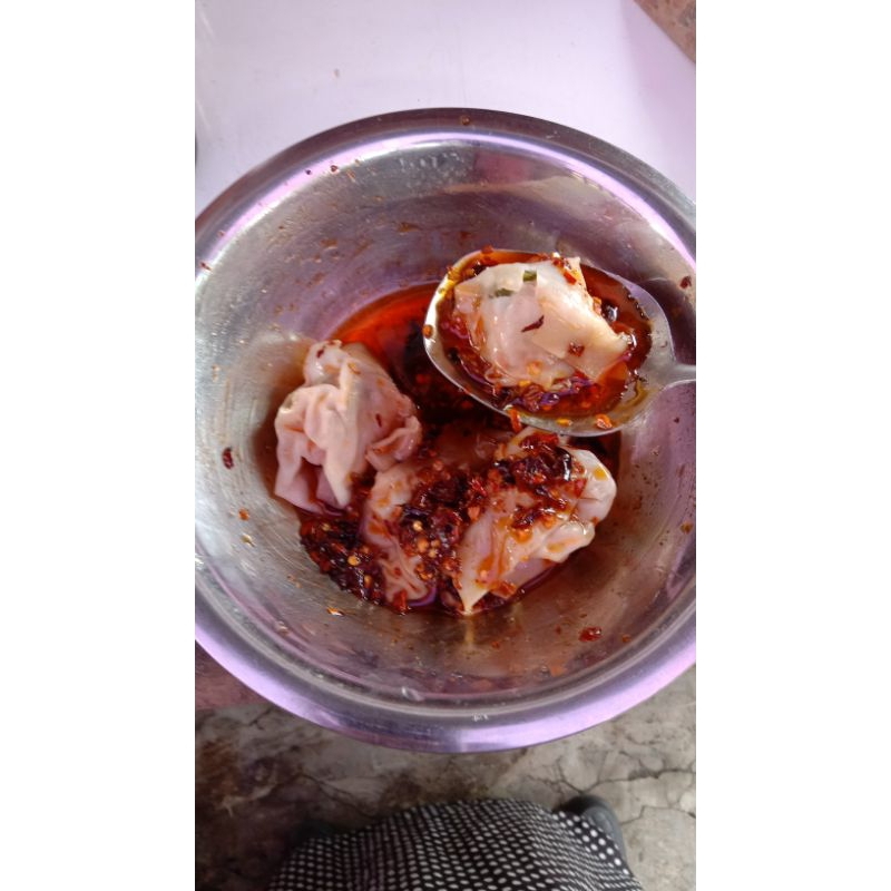 pangsit isi ayam dengan toping chili oil