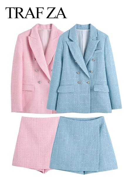 pants traf za women's blazers suit double breasted jacket textured suit coat + slim mini skirt 2 sets fashion female casual streetwear, White
