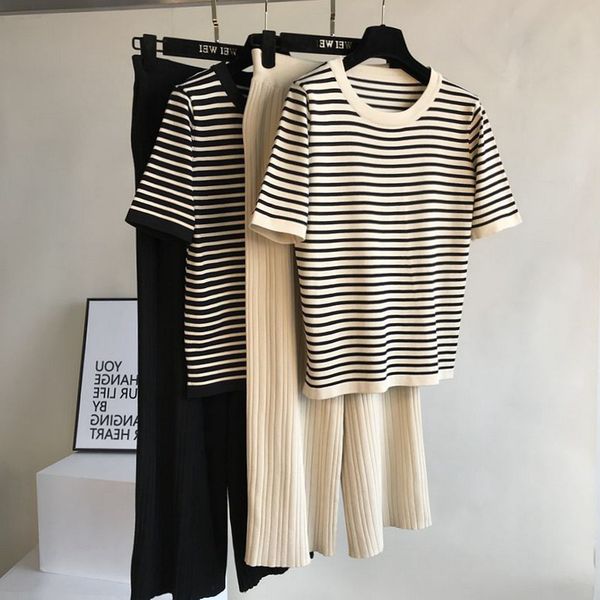 pants women fashion striped knitted pullover high waist lace-up wide leg pant suit short sleeve knit tracksuit trousers 2pcs sets, White