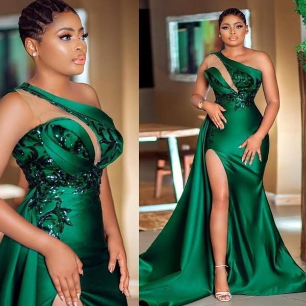party dresses one shoulder mermaid evening dress appliques sleeveless women prom gown green train side split sequined robes de soirée, White;black