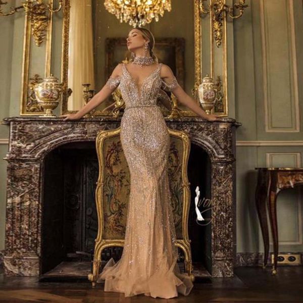 party dresses yqlnne crystals long mermaid evening nude v neck tulle sleeveless beaded robes de soirée vestidos, White;black