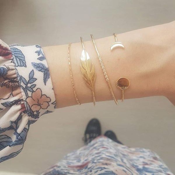 pcs/ set classic bohemian moon round leaf crystal multilayer adjustable open bracelet women fashion party jewelry gift bangle, Black