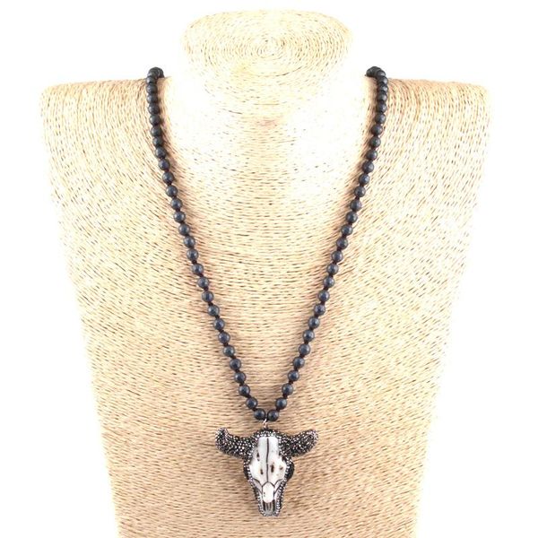 pendant necklaces fashion faceted hematite stone long knotted handmade crystal paved bull head sheep women ethnic necklace, Silver