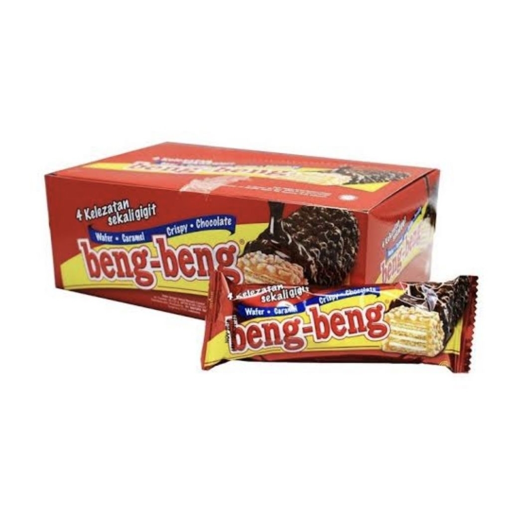 beng beng makanan ringan berupa wafer cokelat yg berlapis caramel dan rice crispy yg cruncy.....