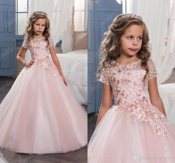 pink flower girls dresses for weddings jewel neck illusion 3d floral lace appliques short sleeves birthday children girl pageant gowns, White;blue