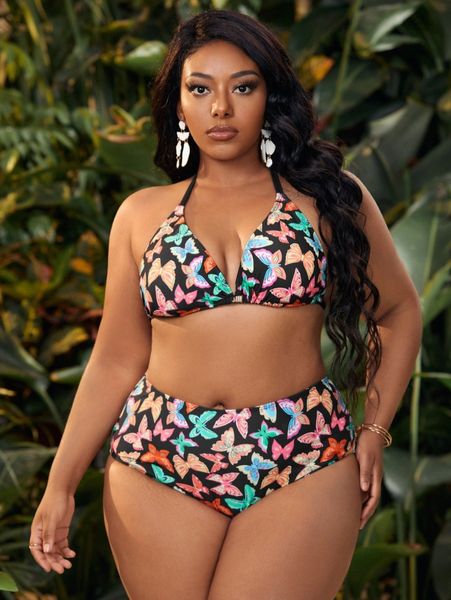 plus butterfly print triangle high waisted bikini swimsuit r3v7#, Black