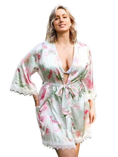 plus floral print eyelash lace trim belted satin robe l1ik#, Black;white