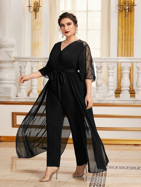 plus lace insert surplice neck belted jumpsuit with skirt z8ax#, Black