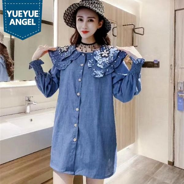 plus size 6xl ruffle collar shirts women designer beading single breasted blouse fashion white black loose denim women's blouses &