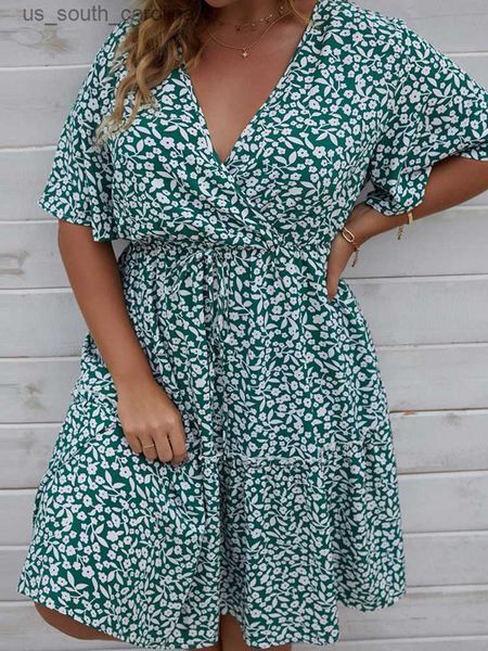 plus size dress woman fashion summer v neck short sleeve floral print casual dress high waist short mini beach dresses l230522, Black;gray