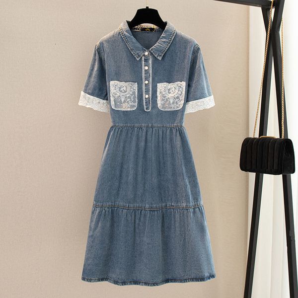 plus size dresses 150kg size women's bust 152cm summer loose lace stitching lapel short sleeve aline denim dress blue 5xl 6xl 7xl 8xl 9, Black