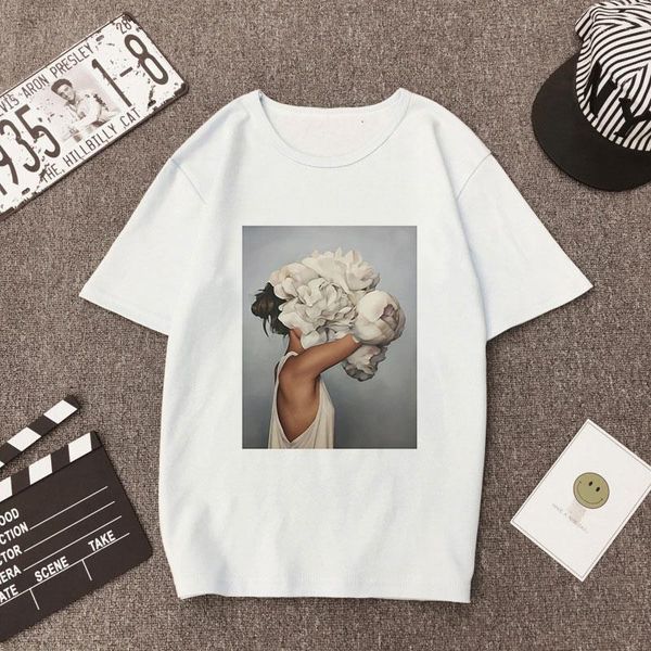 plus size women summer vogue print casual t-shirt lady flowers feather short sleeve o-neck loose tees camisetas mujer, White