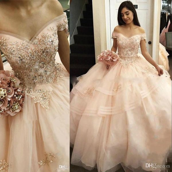 princess blush pink quinceanera dresses ball gown off shoulder lace appliques beads tiered organza sweet 16 floor length pageant prom gowns, Blue;red
