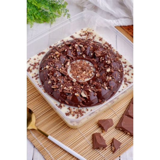puding coklat ditambah fla creamy dengan potongan coklat silverqueen