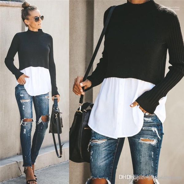 pullover clothing autumn womens designer panelled sweaters fashion crew neck with button female, White;black