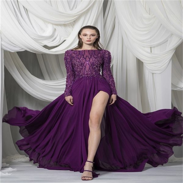 purple evening dress beads sequins long sleeves prom dress appliqued high split sweep train custom made robe de soirée, Black;red