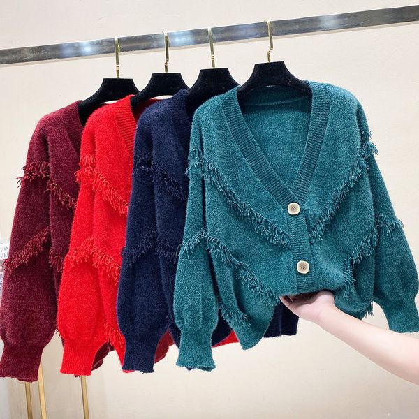 brand name:Â qnpqyx style:Â casual material composition:Â acrylic decoration:Â tassel pattern type:Â solid clothing length:Â regular collar:Â v-neck origin:Â cn(origin) season:Â spring/autumn sleeve length(cm):Â full sleeve style:Â regular material:Â acrylic material:Â viscose material:Â mink cashmere thickness:Â standard closure type:Â single breasted percentage of material:Â 71%-80% gender:Â women yarn thickness:Â regular yarn pattern:Â loose-fitting age:Â ages 18-35 years old