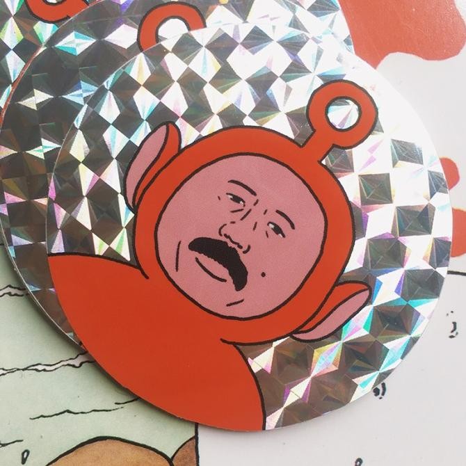 chat admin untuk memastikan ketersediaan stock ya... Stiker bergambar Sugeng si Tubby merah.