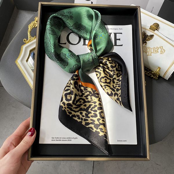 retro summer thin leopard splicing floral green elegant square scarf emulation silk scarf for women all-matching graceful, Blue;gray