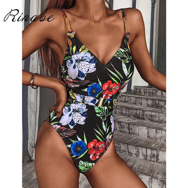 rinabe flowear print swimsuits 2021 bikini deep v neck one piece swimsuit high belt swimwear women bathing suit bikinis beach