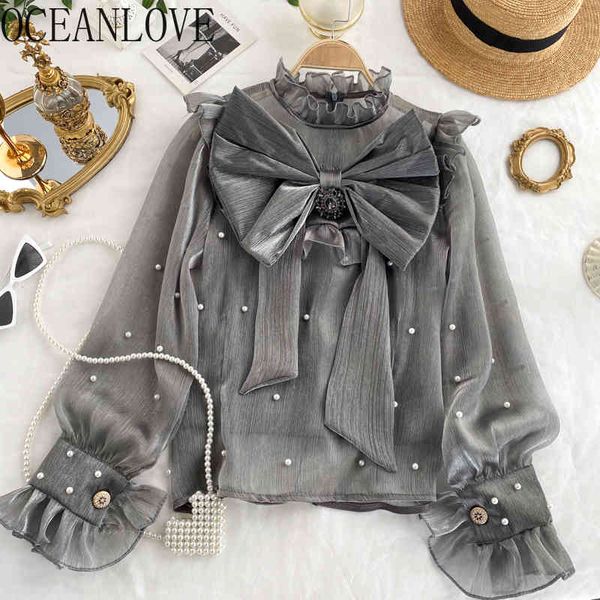 ropa mujer solid korean beading bow elegant office ladies blusas spring ruffles blouse women 19664 210415, White