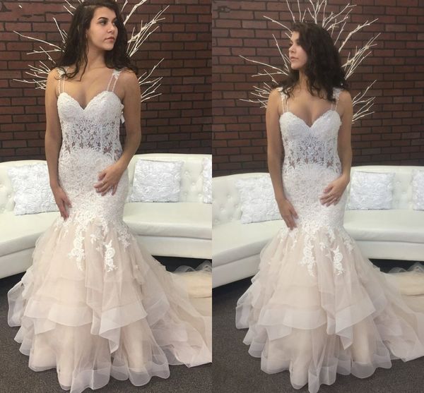 ruffle mermaid wedding reception dresses champagne 2021 spaghetti straps beaded lace applique tulle formal dress party womens bridal gowns, White