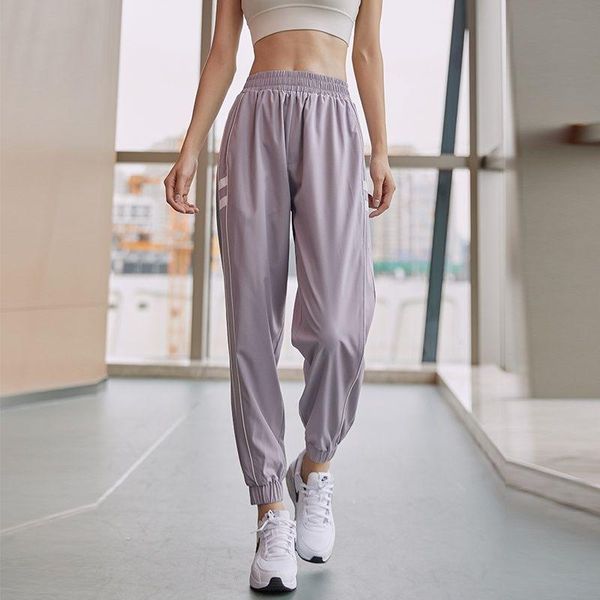 running pants women sports trousers loose high waist tight yoga female fitness breathable elastic band tie feet outdoor stripe, Black;blue