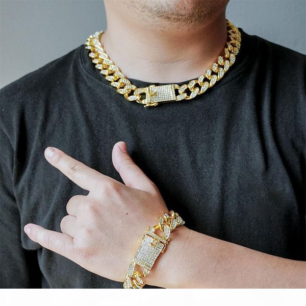 s 20mm prong miami curb cuban chain link necklaces men 's full rhinestone clasp iced out hip hop bracelets set bling bling chains, Silver