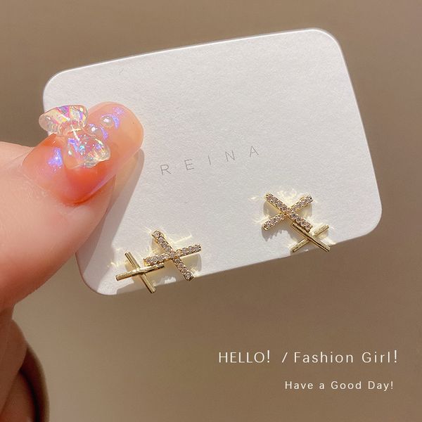 s3593 korean fashion jewelry zircon inlaid cross stud earrings for women niche design crossed earrings, Golden;silver