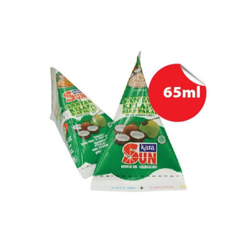 Kara Sun Santan TCA 65ML merupakan santan kelapa siap pakai yang terbuat dari air kelapa yang dikukur. Santan Kara Sun diolah dan dikemas secara modern dan higienis menggunakan sterilisasi tinggi (UHT) sehingga kesegaran dan keaslian santan terjaga dengan baik, serta membuatnya tahan disimpan dalam waktu lama di dalam kulkas. Mengandung lemak nabati kurang lebih 25%, juga dibuat tanpa pengawet sehingga aman digunakan.