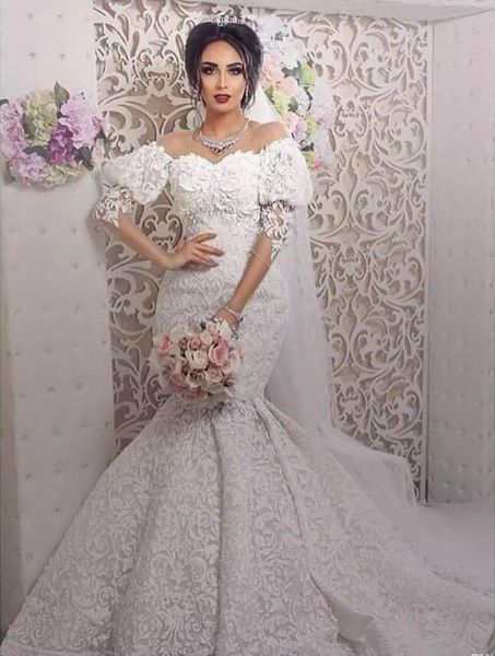 saudi arabic mermaid wedding dresses 2018 lace appliqued sheer jewel neck sweep train boho bridal dress half long sleeve custom made gowns, White