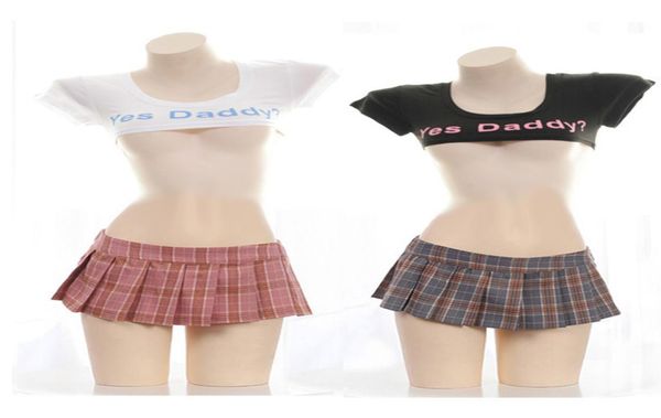 schoolgirl uniforms naughty lingerie plaid pleats half breast yes daddy letter print erotic cosplay mini skirt for sex8498108, Black