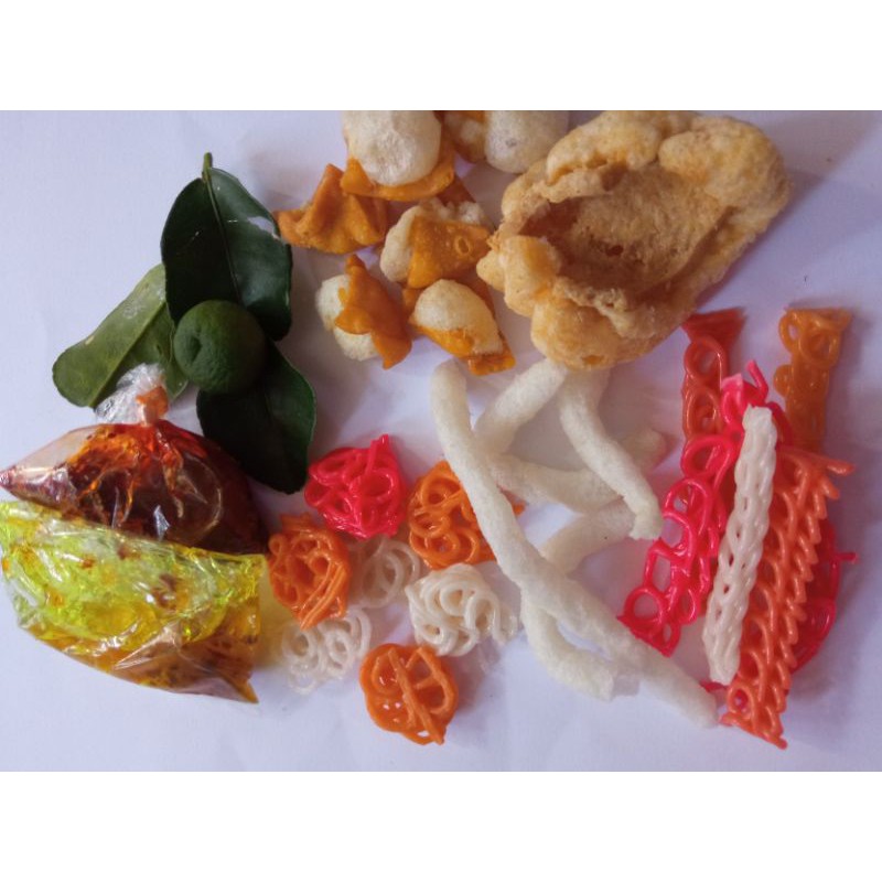 isi aneka kerupuk dan bumbu pelengkap seblak rasa dijamin endoll