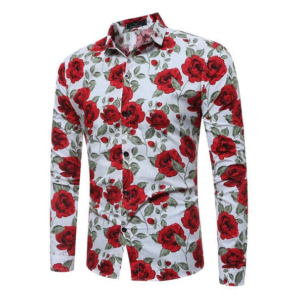 septhydrogen brand mens long sleeve casual shirt fashion rose flower 3d print floral shirt turn-down collar slim fit shirt mens clothing, White;black