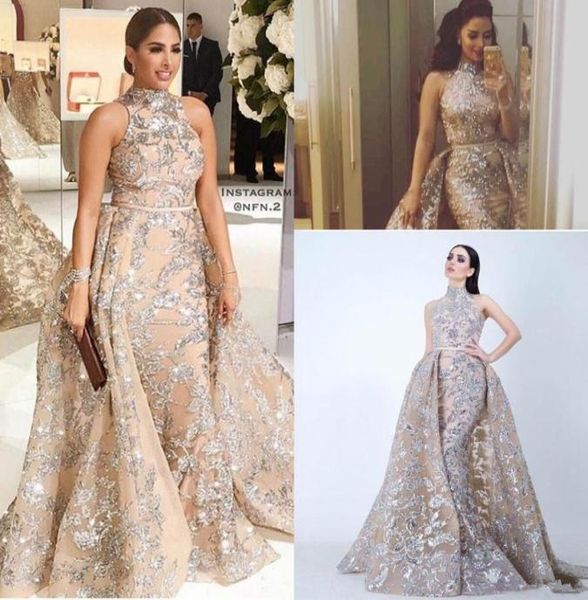 sequined appliques mermaid overskirt evening dresses yousef aljasmi dubai arabic high neck plus size occasion prom party dress7515452, Black