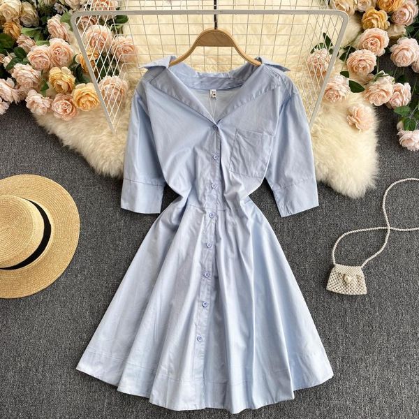 singrein women korean blouses dress retro notched collar single breasted solid office dress summer casual streetwear short dress 210419, Black;gray