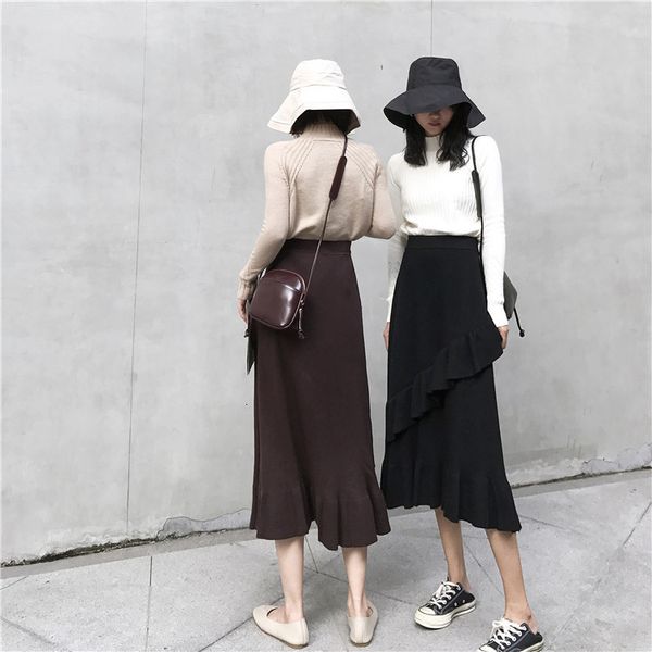 skirts fdfklak ruffle skirt women autumn winter wild a line fishtail skirt hong kong style high waist knitted one-step wool skirts 8860, Black