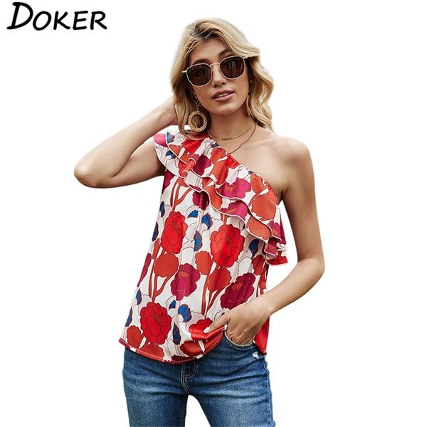 slash neck print floral ruffles sleeveless backless slanted shoulder stitching lotus lace summer women's clothes 210603, White