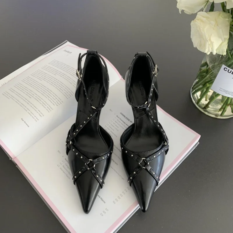 Новинка 2023, Модные Остроносые сандалии с заклепками и вырезами, пикантные туфли для девочек маленького размера 34-35 на высоком каблуке 6 см в ...