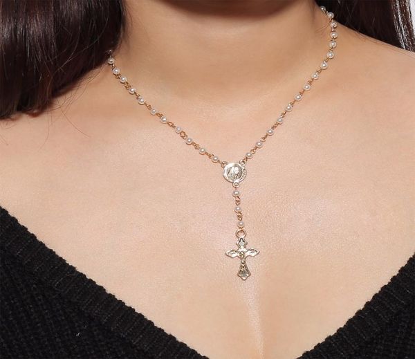 sparkly cross pendant choker necklace long imitation pearl beaded chain rosary madonna coin necklaces pendants religious jewelry7998522, Silver