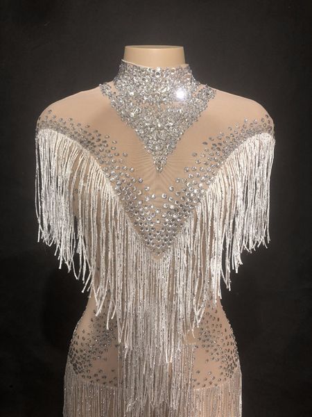 sparkly rhinestone crystal tassel dress women birthday celebrate see through mesh party dresses fringes costume dance dress, Black;red