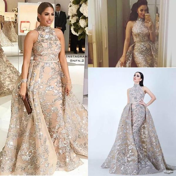 sparkly sequined applique evening dresses with overskirts mermaid yousef aljasmi dubai arabic high neck plus size occasion prom party dress, Black;red