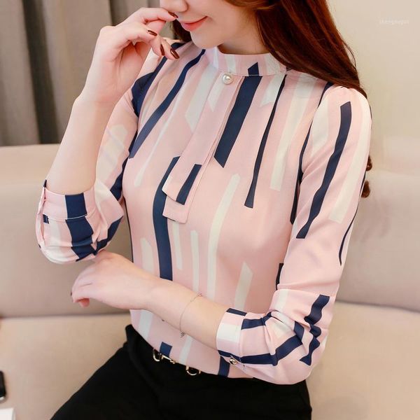 spring fashion super long sleeve striped chiffon shirt 2021 arrival stand collar plus size fairy casual blouse women's blouses & shirts, White