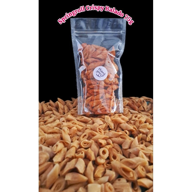 springroll crispy balado 80gr, cemilan yang digoreng dan ditaburi bumbu balado.