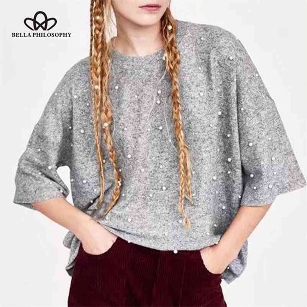 spring women casual three quarter sleeve shirt solid gray female beading o neck knitted ladies 210519, White