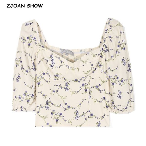 spring women harajuku square collar shirt france style retro elastic ruched floral print half sleeve slim fit blouse 210429, White