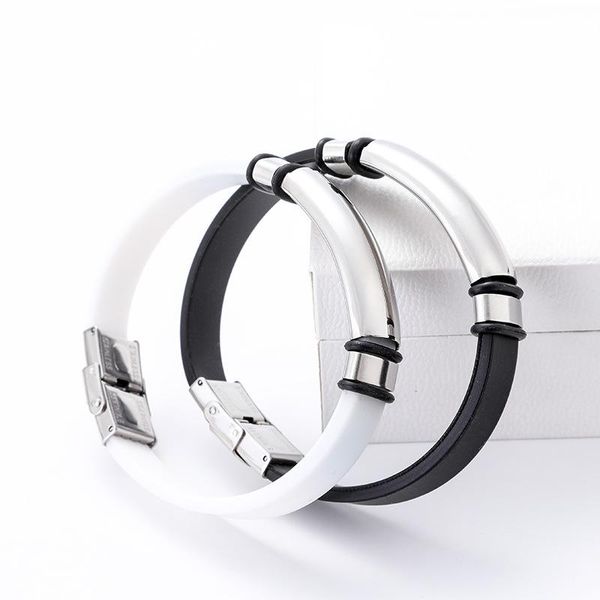 stainless steel curved tube id bar men bangle black white silicone 10mm width adjustable bracelets punk boys jewelry 10pcs, Golden;silver
