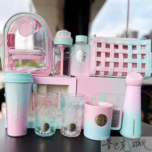 starbucks cup valentine's day pink green gradient glacier pattern copper seal mark glass straw accompanying thermos bag